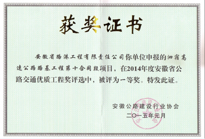 泗宿高速公路路基工程第十合同段獲得2014年度安徽省公路交通優(yōu)質工程獎一等獎