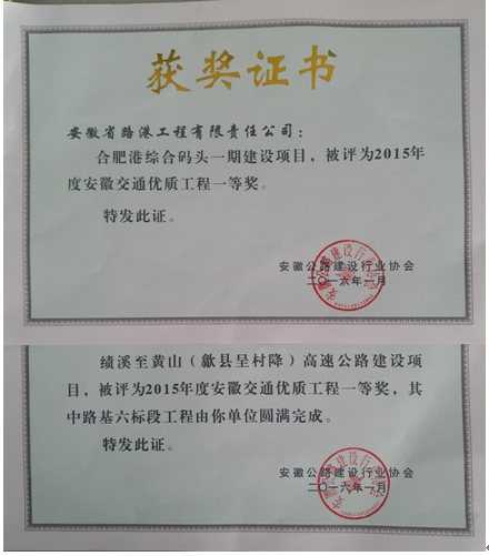 近日傳來好消息,由安徽路港公司承建的績(jī)溪至黃山(歙縣呈村降)高速公路工程、合肥港綜合碼頭一期工程榮獲2015年度安徽省交通優(yōu)質(zhì)工程一等獎(jiǎng)。