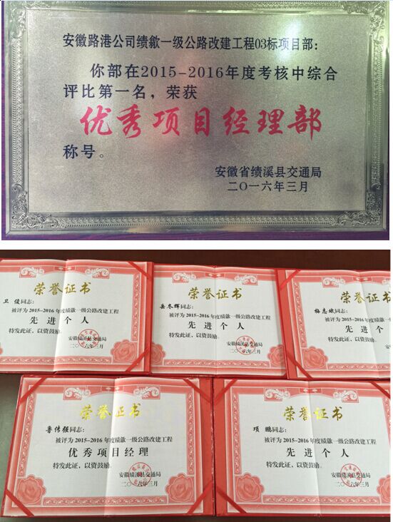 近日,我公司承建的S215績溪至歙縣一級路改建工程03標(biāo),在績溪縣交通局2015年度在建工程綜合考評中,排名第一。榮獲“優(yōu)秀項(xiàng)目經(jīng)理部”、“優(yōu)秀項(xiàng)目經(jīng)理”、“先進(jìn)個(gè)人”等榮譽(yù)稱號。
