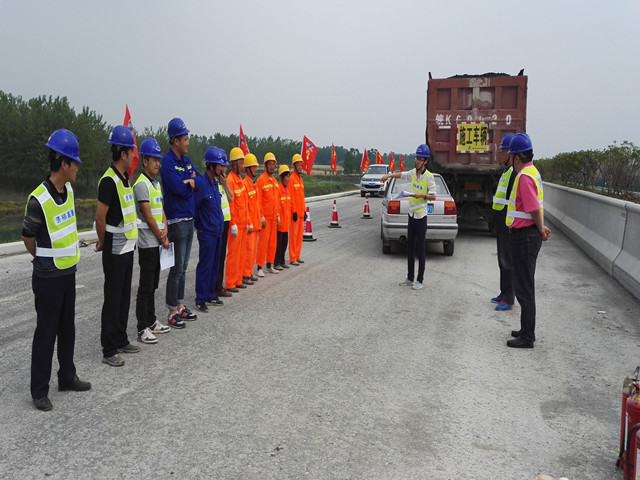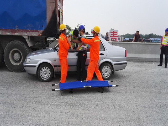 在演練前,演練負責人對相關人員進行了安全救援知識與實際操作培訓,并對演練工作進行了周密的部署安排,布置好了演練現(xiàn)場。下午4點,演練正式開始。演練中模擬了以下場景:在路面施工現(xiàn)場一輛管理車行駛時,與前面一輛瀝青運輸車輛發(fā)生追尾,追尾造成了管理車輛司機及副駕駛人員受傷較重,并因車頭變形無法脫身,同時車輛外部起火。瀝青車輛駕駛員第一時間向應急領導小組報告,接到報告后,救援人員迅速到達事故現(xiàn)場。首先對事故路段進行了交通管制,轉變交通體系,防止發(fā)生二次事故,同時使用滅火器進行滅火,撲滅火源,消除了安全隱患。救援人員迅速用安全錘砸開車玻璃將被困人員迅速救出,對傷者進行簡單了的包扎、紗布止血及人工呼吸,然后用擔架抬上應急車輛迅速轉移至醫(yī)院。