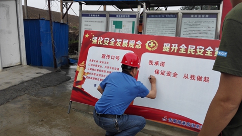 在項目負責人的帶領(lǐng)下,全體人員集體舉起右手莊嚴宣誓:我是一名安徽建工人,我鄭重宣誓,時刻注意安全,遵守安全法則。履行安全職責,提高安全技能。杜絕三違現(xiàn)象,保證四不傷害。強化紅線意識,促進安全發(fā)展。為了家人的幸福,企業(yè)發(fā)展,誓做建工“安全人”。隨后,全體職工在活動橫幅上簽下了自己的名字。