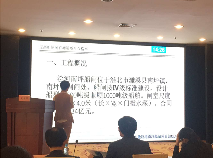 安徽路港南坪船閘項(xiàng)目部QC小組、滁淮高速公路定長段預(yù)制標(biāo)QC小組、銅陵北路高架橋QC小組參與了本次發(fā)表與交流,分別發(fā)表交流了“提高船閘閘首廊道質(zhì)量合格率、裝配式箱(拱)涵節(jié)段鋼筋保護(hù)層質(zhì)量控制、提高鋼筋直螺紋套筒一次連接合格率”3項(xiàng)成果。