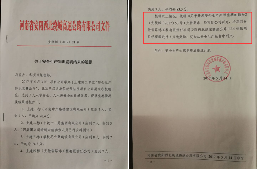 安陽繞城高速項目部在建設單位安全生產(chǎn)知識競賽中榮獲第一名