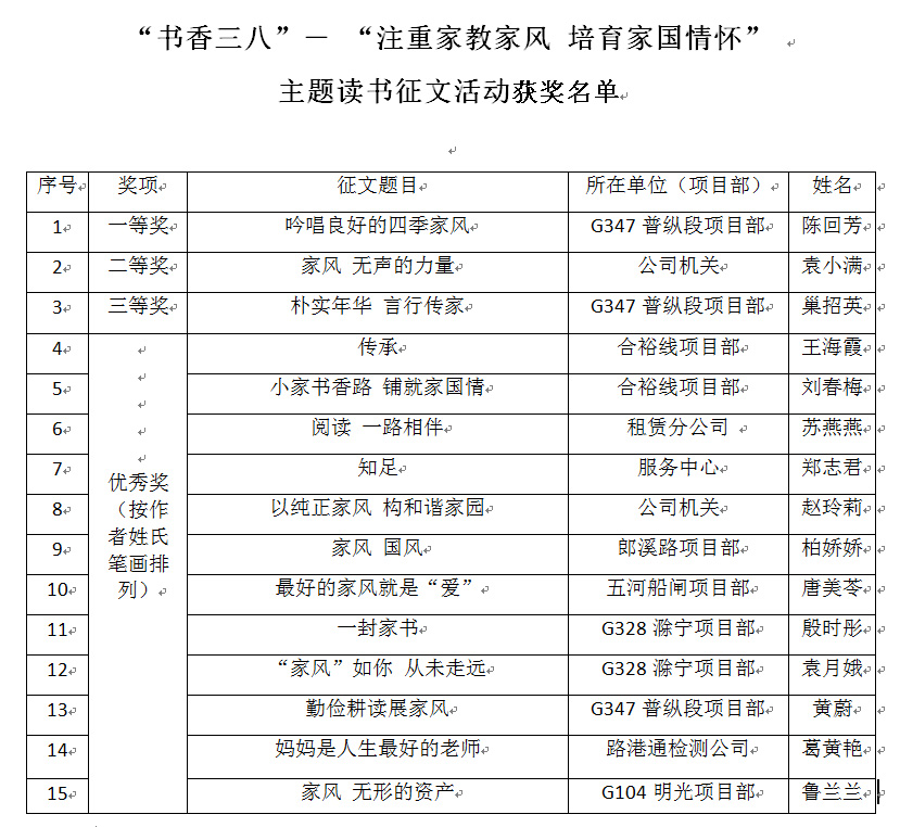 為響應(yīng)集團(tuán)公司工會(huì)號(hào)召,安徽路港公司工會(huì)組織開(kāi)展了“書(shū)香三八”- “注重家教家風(fēng) 培育家國(guó)情懷”主題讀書(shū)征文活動(dòng),現(xiàn)已圓滿結(jié)束。