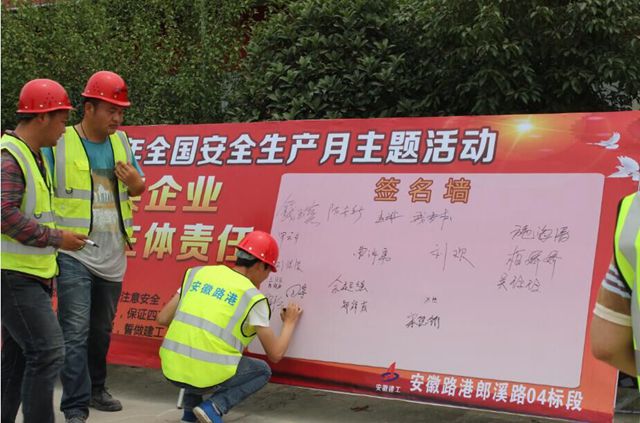 (圖為合肥市郎溪路高架項(xiàng)目部舉辦“安全生產(chǎn)月”宣誓簽名活動(dòng))
