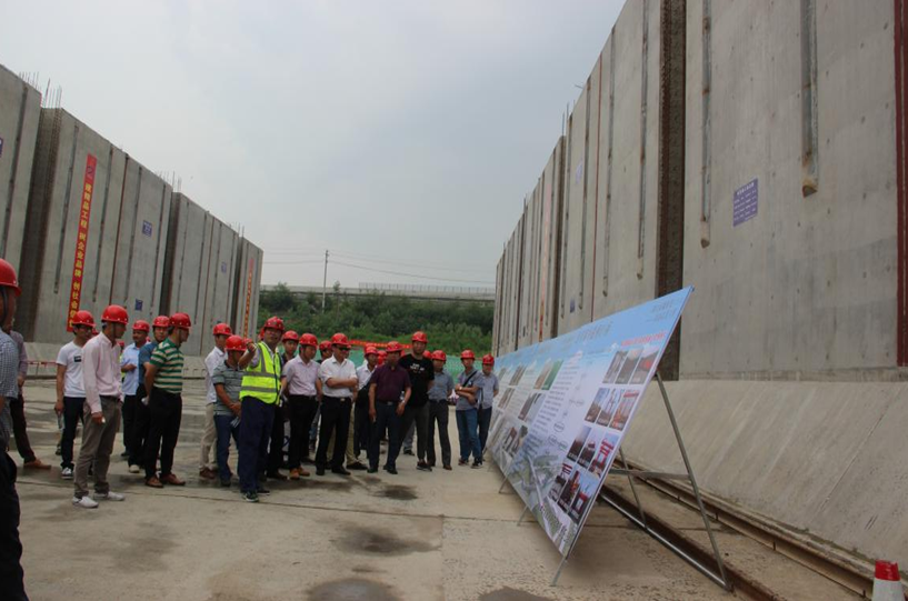 在施工現(xiàn)場(chǎng),項(xiàng)目負(fù)責(zé)人結(jié)合現(xiàn)場(chǎng)的宣傳展板就項(xiàng)目場(chǎng)地布設(shè)標(biāo)準(zhǔn)化、施工工藝標(biāo)準(zhǔn)化、管理行為標(biāo)準(zhǔn)化、創(chuàng)新標(biāo)準(zhǔn)化、輕型移動(dòng)門架支撐系統(tǒng)施工工藝、工程進(jìn)展情況及采取的質(zhì)量管控措施向觀摩團(tuán)進(jìn)行了介紹。觀摩團(tuán)成員在現(xiàn)場(chǎng)對(duì)閘室墻身、閘首廊道、邊墩空箱進(jìn)行了察看,仔細(xì)詢問了施工工藝、質(zhì)量控制、技術(shù)創(chuàng)新等方面的問題。布置整潔的施工場(chǎng)地,標(biāo)準(zhǔn)化的安全防護(hù),規(guī)范化的施工工藝,內(nèi)實(shí)外美的施工質(zhì)量,讓觀摩人員連連稱贊。