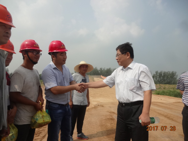 7月28日上午,馬鞍山市交通局局長陳長春在交通局副局長張建華、公路局局長陳衛(wèi)東和項目辦主任夏松的陪同下,來到安徽路港承建的S367馬鞍山段(北部通道)改建工程NO4-1標項目部“送清涼”。 陳長春與全體建設者親切握手并送上了防暑降溫用品,在聽取了項目負責人關于近期工作進展情況及防暑降溫措施的匯報后,要求項目部合理安排施工時間,避免高溫時間段現場作業(yè),切實做好防暑降溫工作,保證工程進度與質量,確保年底通車既定目標的順利實現。