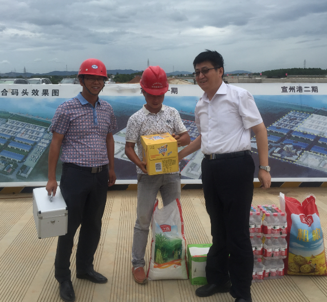 8月1日上午,安徽省港航建設(shè)投資集團(tuán)董事長(zhǎng)李家俊在項(xiàng)目辦主任丁龍喜的陪同下,赴安徽路港承建的宣州港項(xiàng)目“送清涼”。