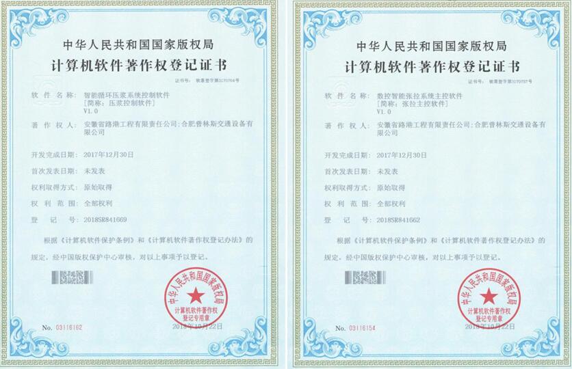 近日,安徽路港公司依托在研課題“安徽省《預(yù)應(yīng)力數(shù)控智能張拉系統(tǒng)施工技術(shù)規(guī)程》”開發(fā)的《數(shù)控智能張拉系統(tǒng)》和《智能循環(huán)壓漿系統(tǒng)》兩項計算機軟件,經(jīng)過中國版權(quán)保護中心審核后,喜獲中華人民共和國國家版權(quán)局原始認(rèn)定并予以著作權(quán)登記。