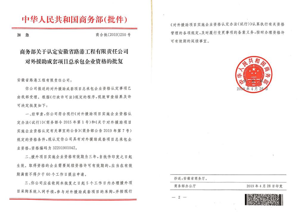 近日,安徽路港公司收到商務(wù)部下發(fā)的《商務(wù)部關(guān)于認(rèn)定安徽省路港工程有限責(zé)任公司對外援助成套項(xiàng)目總承包企業(yè)資格的批復(fù)》(商合批[2019]250號),獲得對外援助成套項(xiàng)目總承包企業(yè)資格。此次成功獲批對安徽路港公司承攬國家層面援外項(xiàng)目,開展國際化經(jīng)營和實(shí)現(xiàn)健康可持續(xù)發(fā)展具有重要意義。