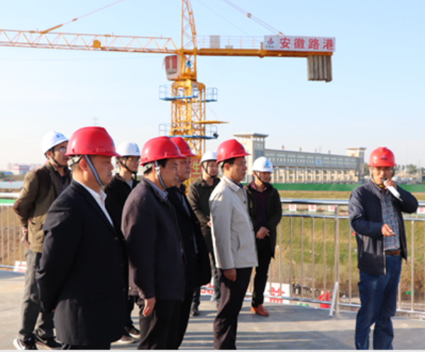 余總經(jīng)理一行先來到靈璧船閘工程施工現(xiàn)場、料倉大棚、鋼筋加工場進行實地察看。在聽取項目負責人對現(xiàn)場施工管理、標準化建設、工藝創(chuàng)新等相關(guān)情況介紹后,余正發(fā)總經(jīng)理對項目建設進展給予了充分肯定,并對項目建設過程中采用的新技術(shù)、新工藝、新工法表示高度贊揚。