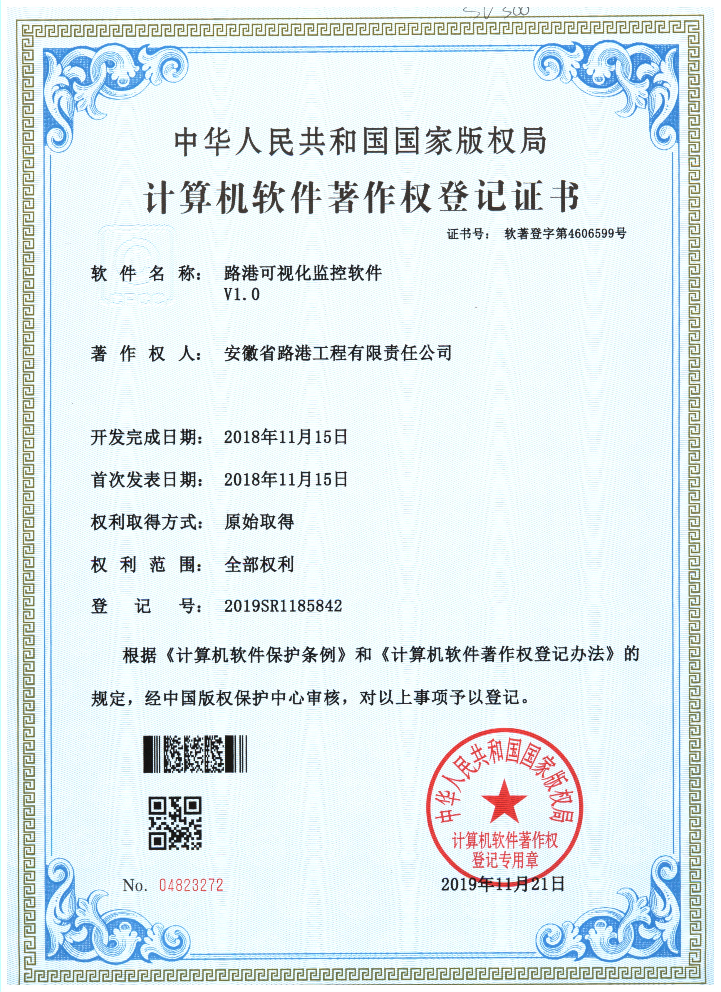 近日,安徽路港公司新取得“路港可視化監(jiān)控軟件V1.0”“路港可視化工程監(jiān)控管理軟件V1.0”兩項(xiàng)計(jì)算機(jī)軟件著作權(quán)。