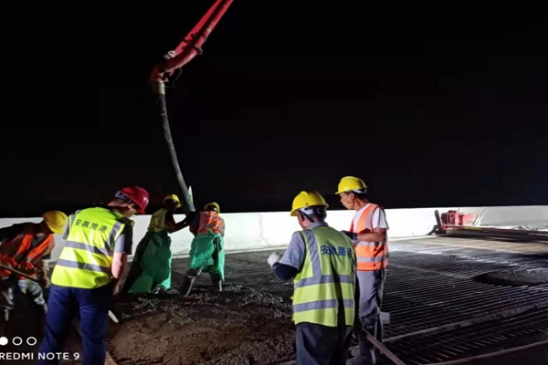 G236青通河項目全體員工鼓足干勁,橋面系施工、路面水穩(wěn)攤鋪等多點平行作業(yè)。為充分提高夜間施工生產(chǎn)作業(yè)效率,項目部提前統(tǒng)籌規(guī)劃,針對夜間可施工內(nèi)容,科學(xué)制定夜間施工方案,加快了項目的進(jìn)度。國慶期間,完成了左幅橋面鋪裝、路面水穩(wěn)攤鋪,為10月8日左幅順利通車打下基礎(chǔ)。