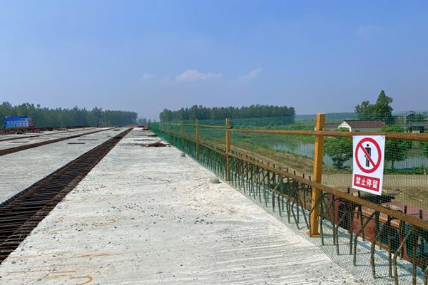 銅陵市G236青通河大橋項(xiàng)目部通過(guò)加強(qiáng)安全文化建設(shè),進(jìn)一步推動(dòng)安全標(biāo)準(zhǔn)化施工。在橋梁施工方面,橋面施工入口采用剛性防護(hù)和制作大門進(jìn)行封閉式施工,設(shè)置進(jìn)入施工現(xiàn)場(chǎng)十不準(zhǔn)、單元預(yù)警牌、安全入場(chǎng)告知牌、高溫天氣發(fā)布牌等標(biāo)志標(biāo)牌對(duì)施工人員進(jìn)行安全警示。臨邊護(hù)欄采用雙層護(hù)欄圍護(hù),上掛安全網(wǎng)與警示標(biāo)牌,此類防護(hù)既能防止人員高處墜落,又能提升項(xiàng)目的安全管理形象。