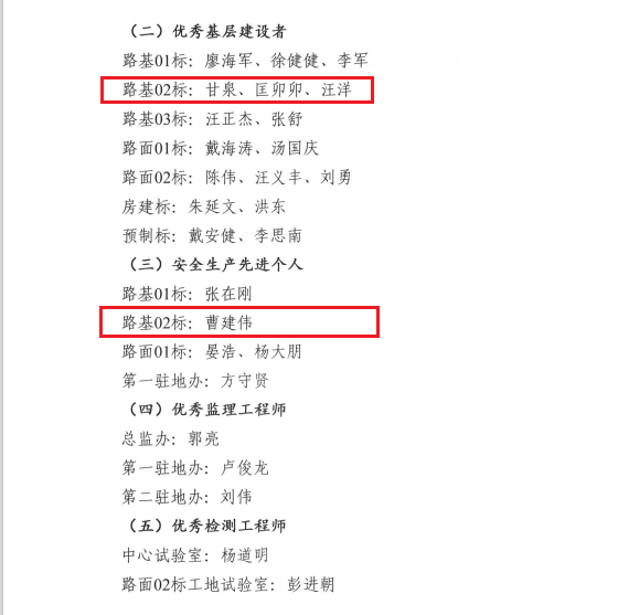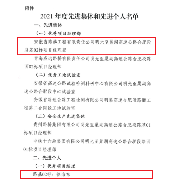 1月24日,明巢路基02標(biāo)在明巢高速公路合肥段項目公司2021年度項目綜合考評比分中排名第一,并榮獲“優(yōu)秀項目經(jīng)理部”榮譽稱號,其中徐海東同志榮獲“優(yōu)秀項目經(jīng)理”稱號,甘泉、匡卯卯、汪洋三名同志榮獲“優(yōu)秀基層建設(shè)者”稱號,曹建偉同志榮獲“安全生產(chǎn)先進個人”稱號。