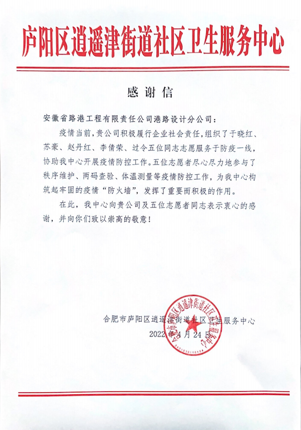 4月24日,勘測設(shè)計(jì)研究院收到合肥市廬陽區(qū)逍遙津街道社區(qū)衛(wèi)生服務(wù)中心的感謝信,信中對于曉紅、蘇豪、趙丹紅、李倩榮、過令五位同志積極投身于社區(qū)疫情防控工作給予了高度肯定和衷心感謝。 感謝信中指出,疫情當(dāng)前,勘設(shè)院志愿者們積極響應(yīng)公司號召,踴躍投入防疫一線,始終與社區(qū)工作人員一起在秩序維護(hù)、體溫測量、兩碼查驗(yàn)的主戰(zhàn)場上并肩作戰(zhàn),構(gòu)筑起基層疫情防控的嚴(yán)密防線,以實(shí)際行動(dòng)踐行了“奉獻(xiàn)、友愛、互助、進(jìn)步”的志愿者精神,共同為打贏疫情防控阻擊戰(zhàn)作出了積極貢獻(xiàn)。