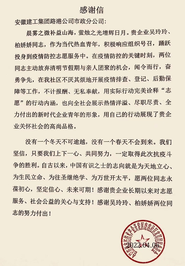 清明節(jié)期間,市政分公司員工吳玲玲與柏嬌嬌赴新站區(qū)磨店社區(qū)參與志愿服務(wù)活動(dòng),全力配合社區(qū)完成疫情排查、人員信息登記、后勤保障等工作,為此新站區(qū)磨店社區(qū)特發(fā)來感謝信。