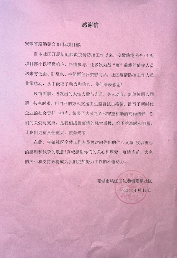 自開展疫情防控工作以來,蕪合01標(biāo)項(xiàng)目嚴(yán)防死守,對內(nèi)嚴(yán)格落實(shí)集團(tuán)、公司各項(xiàng)防疫措施,對外積極配合當(dāng)?shù)卣黜?xiàng)防疫政策。此外,項(xiàng)目青年職工組成青年突擊隊(duì)多次為戰(zhàn)“疫”前線值守人員送去面包、礦泉水、方便面等慰問品,用自己的方式支援抗疫大戰(zhàn),并收到來自雍鎮(zhèn)社區(qū)的感謝信,展現(xiàn)了新時(shí)代國有企業(yè)的責(zé)任與擔(dān)當(dāng)!