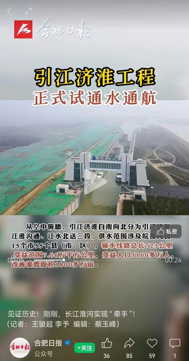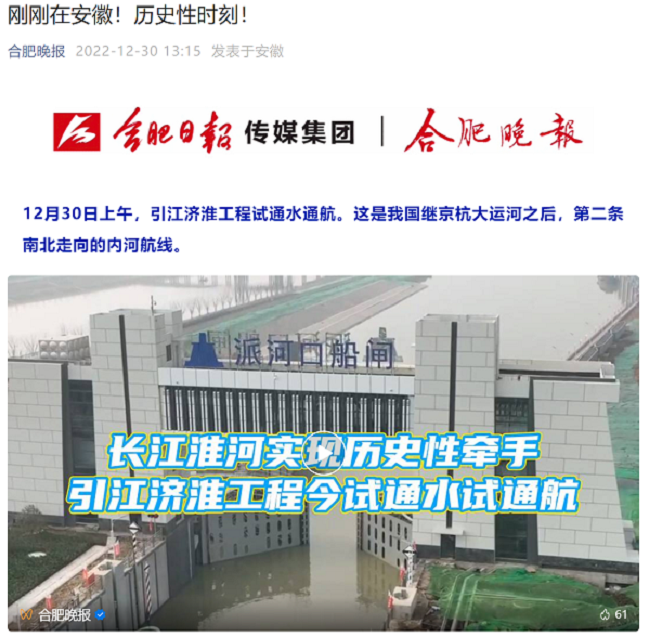 媒體報(bào)道丨人民網(wǎng)、安徽日?qǐng)?bào)、合肥日?qǐng)?bào)等主流媒體聚焦引江濟(jì)淮工程試通水通航