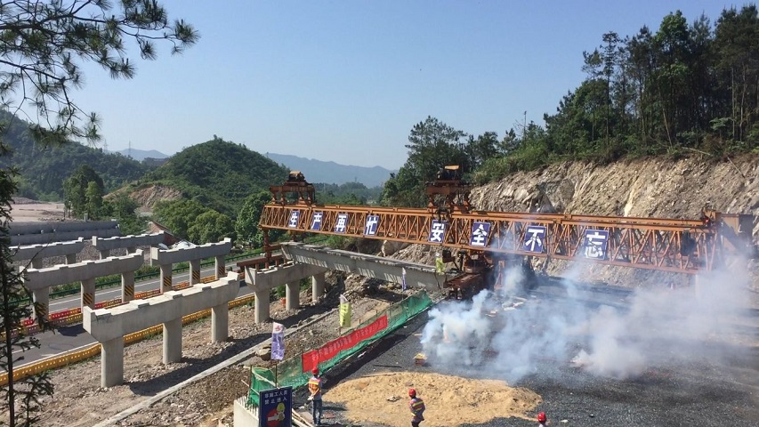 5月12日上午,伴隨著喜慶的鞭炮聲,在項目部領導班子的現場指導下,梅公橋首片箱梁架設成功。