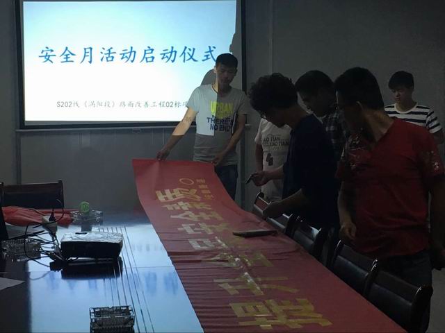 為認(rèn)真開展以“強(qiáng)化安全發(fā)展觀念,提升全民安全素質(zhì)”為主題的2016年第十五個全國“安全生產(chǎn)月”活動,推動項(xiàng)目安全發(fā)展,6月8日晚,S202線(渦陽段)路面改善工程項(xiàng)目部組織全體員工,在項(xiàng)目部會議室舉行了“安全生產(chǎn)月”啟動儀式及簽名宣誓活動。