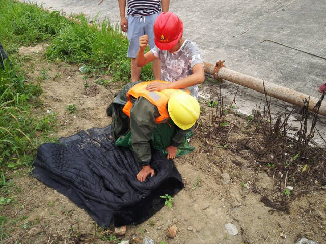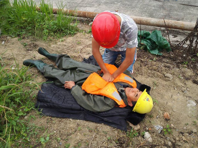 演練假設(shè)在合肥港上游2#靠船墩施工作業(yè)平臺處臨水面作業(yè),一名工人不慎失足跌落水中,工人身體狀況良好,落水時穿戴有救生衣。由于不會水性,在水中拼命掙扎嗆了好幾口水,體力不支,身體慢慢開始下沉,現(xiàn)場救援人員迅速營救落水者上岸,發(fā)現(xiàn)其已經(jīng)處于休克昏迷狀態(tài),應(yīng)急救援人員對落水者進行人工呼吸和心肺復(fù)蘇后緊急送往醫(yī)院。