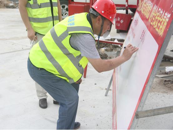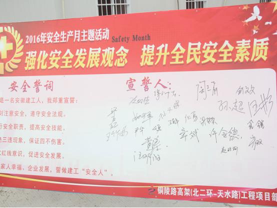為響應(yīng)全國“安全生產(chǎn)月”活動(dòng)號召,6月22日下午,合肥市銅陵路高架項(xiàng)目部全體職工在公司安全管理部經(jīng)理凌必勝的帶領(lǐng)下,開展“安全生產(chǎn)月”宣誓簽名儀式。