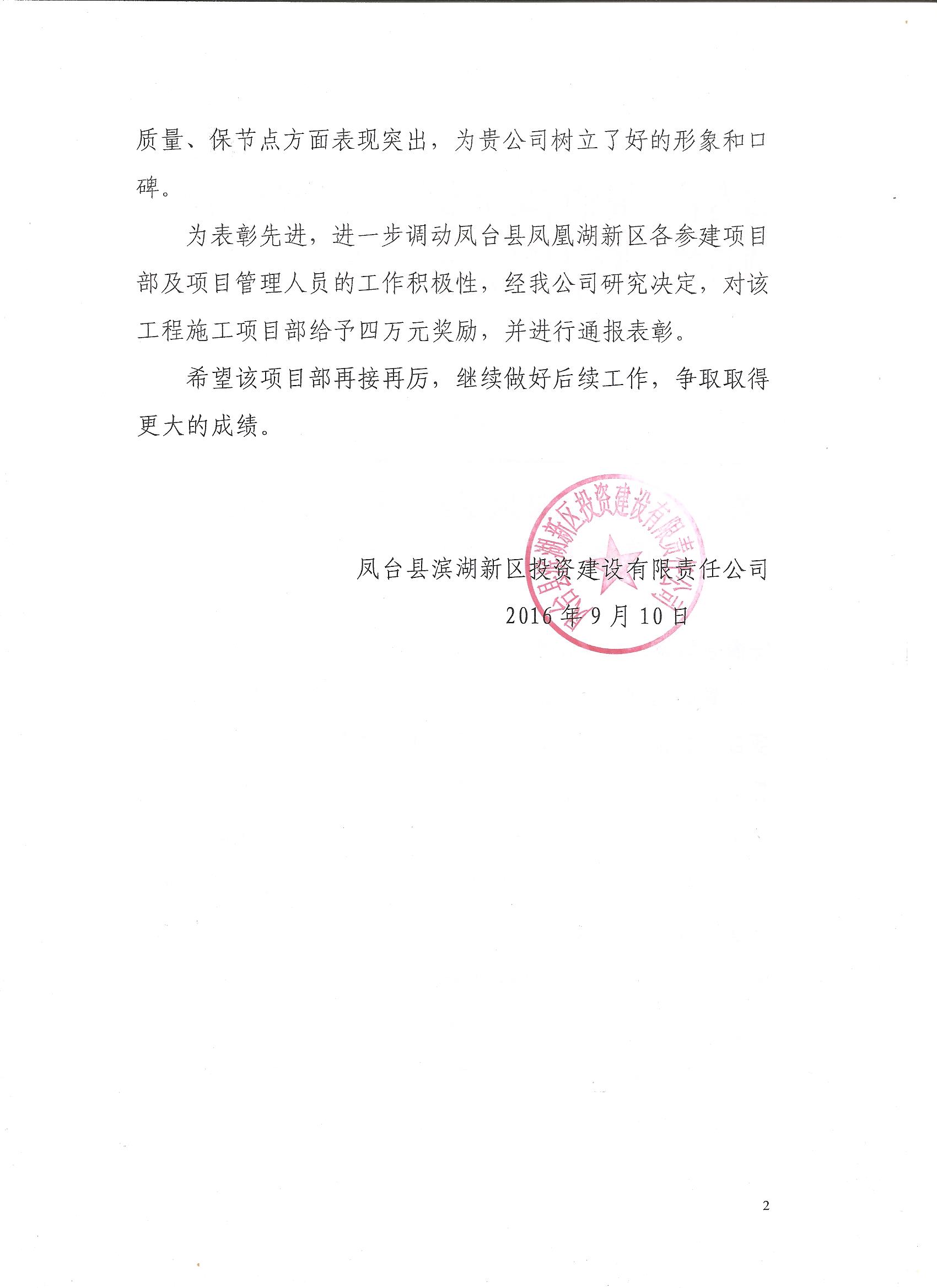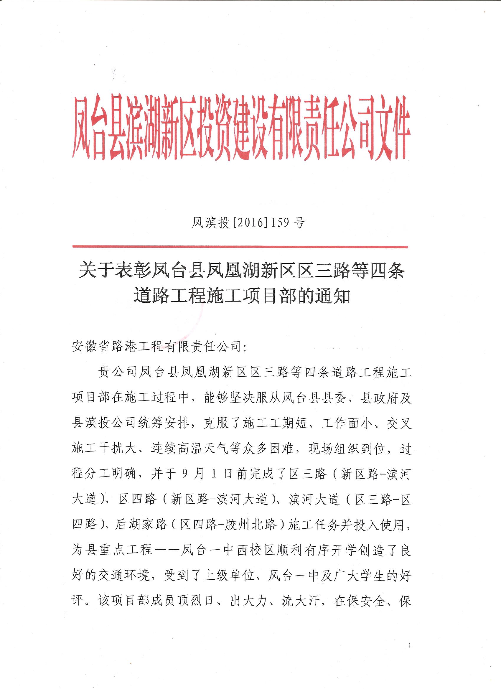在工程施工中,項(xiàng)目部堅(jiān)決服從鳳臺縣縣委、縣政府及業(yè)主單位的統(tǒng)籌安排,克服了施工工期短、工作面小、交叉施工干擾大、連續(xù)高溫等困難,現(xiàn)場組織到位,責(zé)任分工明確,為鳳臺縣重點(diǎn)工程―鳳臺新一中如期開學(xué)提供了良好的交通環(huán)境,受到了上級單位的一致好評。項(xiàng)目部在抓進(jìn)度的同時,確保安全、質(zhì)量無事故,為公司在鳳臺縣樹立了良好的形象和口碑,受到了業(yè)主單位以正式紅頭文件的形式通報表彰并給予肆萬元獎勵,這是鳳臺縣的首次。