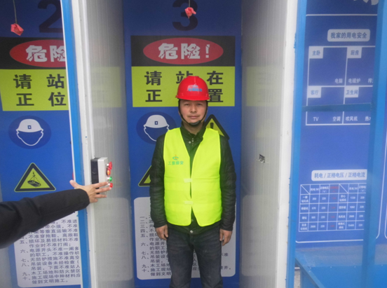 班前會中安全教育活動(dòng),施工人員進(jìn)行安全帽撞擊體驗(yàn)