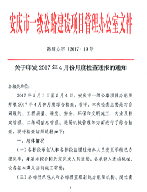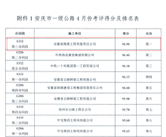 5月11日,安慶市交通投資有限公司對(duì)2017年4月份施工單位月度檢查考評(píng)情況進(jìn)行了通報(bào),S332安慶至望江改建工程施工三標(biāo)以總得分96.9分排名第一。