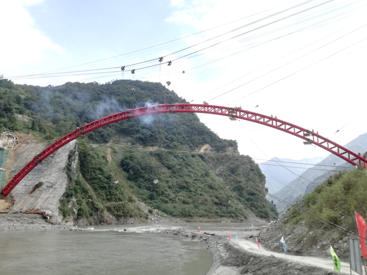 自開工以來,項(xiàng)目部全體建設(shè)者團(tuán)結(jié)一心、迎難而上,陸續(xù)攻克了大體積拱座基坑開挖、巖體破碎、大型鋼結(jié)構(gòu)加工場地狹窄、拱肋空中吊裝合攏精度及線性控制難、纜索吊裝施工難度大等多項(xiàng)技術(shù)難題。