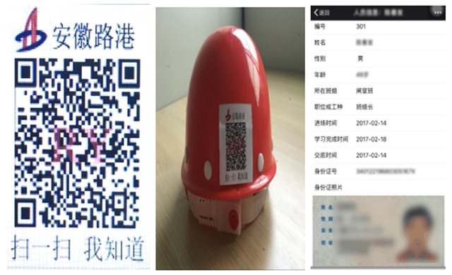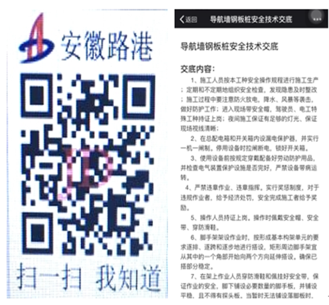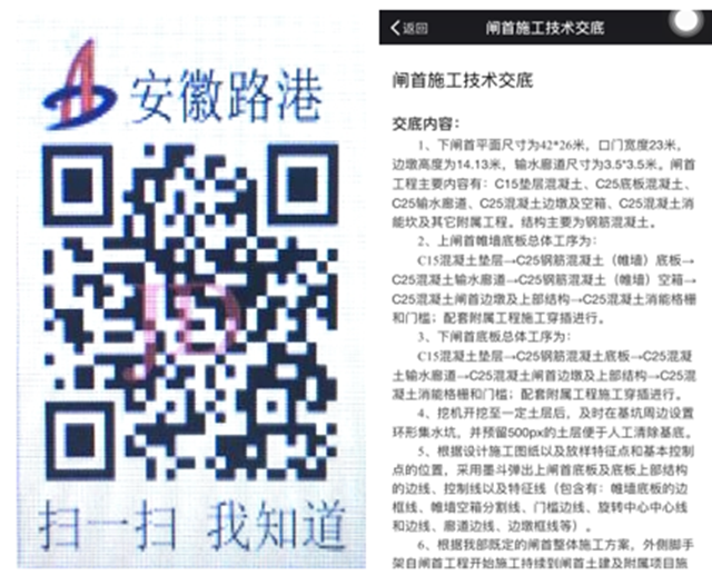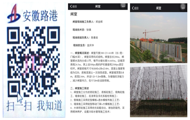 近日,在南坪船閘項(xiàng)目部駐地和施工現(xiàn)場,現(xiàn)場技術(shù)員和班組工人拿著手機(jī),對著識別卡和展板上的二維碼掃一掃,“