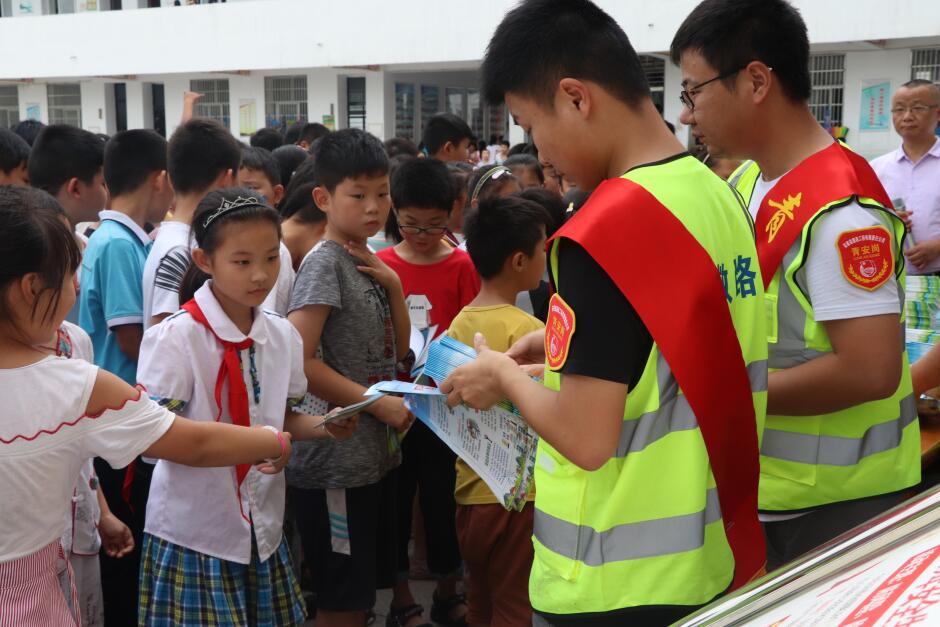 青年志愿者們向小學(xué)生發(fā)放安全知識(shí)宣傳單和宣傳冊(cè),與小朋友們互動(dòng)交流,講解安全知識(shí),耐心細(xì)致回答小朋友的問題。