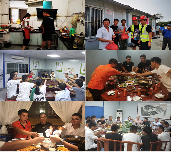 夜幕降臨,項(xiàng)目部一片祥和氣氛,一邊是職工們?yōu)閯趧?wù)工人送來慰問品,一邊是食堂里準(zhǔn)備的豐盛佳肴,大家在歡聲笑語間互道節(jié)日問候,向遠(yuǎn)在家鄉(xiāng)的親人們訴親情、話平安。
