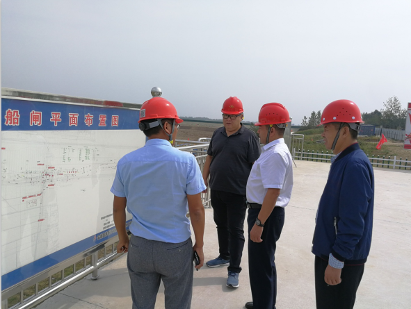 2019年9月25日,宿州市交通局副局長端祥宇在市地方海事局安全監(jiān)督科科長王之皓、靈壁縣地方海事處副處長張登發(fā)、業(yè)主相關(guān)負責(zé)人的陪同下到二分公司靈璧船閘項目檢查指導(dǎo)工作。