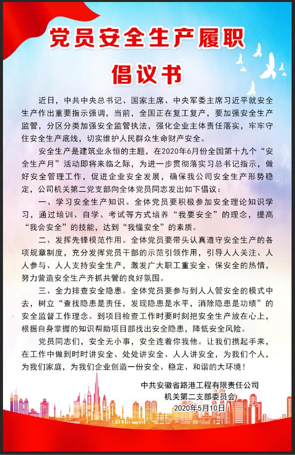 安全生產(chǎn)是建筑業(yè)永恒的主題,在2020年6月份全國第十九個(gè)“安全生產(chǎn)月”活動(dòng)來臨之際,公司機(jī)關(guān)第二黨部支部發(fā)起此次倡議,目的在于營造安全管理,人人有責(zé)的良好氛圍,為公司5月份產(chǎn)值滿產(chǎn)超產(chǎn)乃至全年經(jīng)濟(jì)目標(biāo)的實(shí)現(xiàn)厚植安全基礎(chǔ)。