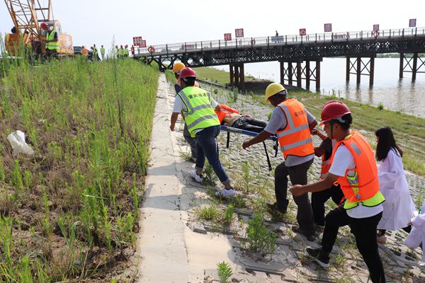演練以假人落水開始,項(xiàng)目經(jīng)理啟動應(yīng)急預(yù)案,搶險(xiǎn)組立即上搜救船舶營救落水人員,同時(shí),安全保衛(wèi)組封鎖現(xiàn)場,通訊組聯(lián)系醫(yī)院,待落水人員救起后,現(xiàn)場醫(yī)療救護(hù)組進(jìn)行簡單施救,立即送往醫(yī)院進(jìn)行救治。最后,事故調(diào)查組進(jìn)行現(xiàn)場勘察,調(diào)查事故原因。此次演練提高了全員安全意識,增強(qiáng)了項(xiàng)目部管理人員應(yīng)對水上施工突發(fā)事件的應(yīng)急處理能力。