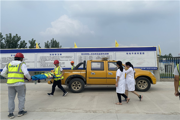 本次應(yīng)急演練結(jié)合項(xiàng)目部實(shí)際,有針對性地模擬拌合站門樓安裝過程中未系掛安全帶導(dǎo)致人員受傷的情景。演練開始前,項(xiàng)目部召開動(dòng)員部署會(huì),成立演練領(lǐng)導(dǎo)小組,明確人員分工。應(yīng)急演練正式開始后,各小組按照責(zé)任分工進(jìn)行應(yīng)急疏散,對現(xiàn)場進(jìn)行安全警戒,保證救援道路暢通,對傷者進(jìn)行醫(yī)療檢查,并送往醫(yī)院救治。整個(gè)演練過程緊張有序。演練結(jié)束后,項(xiàng)目部還舉行了防暑降溫物品發(fā)放活動(dòng)。