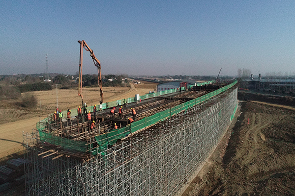 無岳高速05標(biāo)順利完成桐城南樞紐互通B匝道橋支架現(xiàn)澆底板砼澆筑