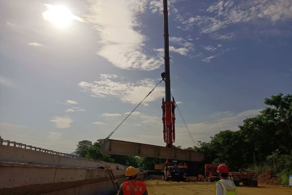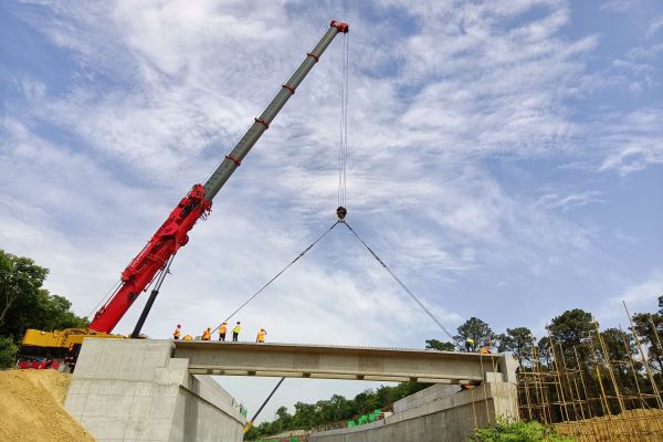 5月25日,九華東路三期道路工程項(xiàng)目首片預(yù)制T梁架設(shè)成功。