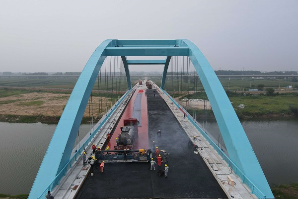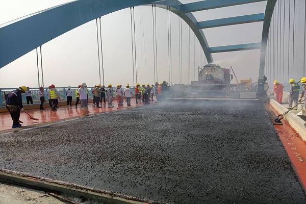 S328楊橋泉河大橋及接線工程主橋鋼橋面下面層澆筑式瀝青混凝土攤鋪完成