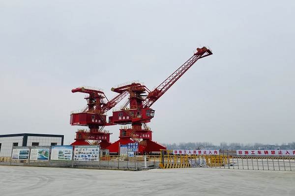 1月12日,阜陽港臨泉港區(qū)綜合碼頭工程20t-28m、40t-28m龍門起重機圓滿安裝完成。