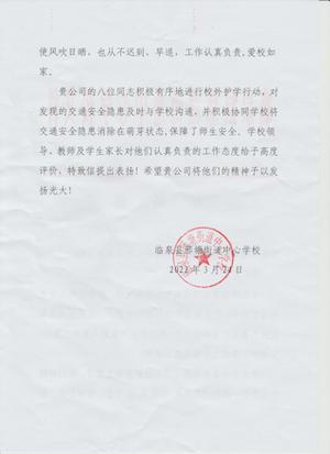 活動現(xiàn)場,志愿者們合理分工,指揮車輛有序停放,幫助學(xué)生安全穿過馬路,大大提升學(xué)生過馬路的安全指數(shù),獲得了家長們的交口稱贊,學(xué)校領(lǐng)導(dǎo)、老師對于此次志愿者服務(wù)活動給予高度評價,并致信表揚。