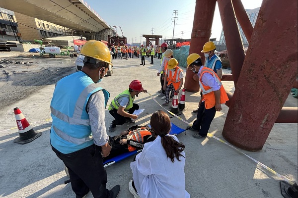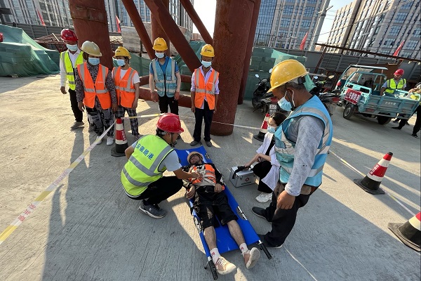 演練地點(diǎn)設(shè)在橋梁施工現(xiàn)場,模擬了1名工人在高處作業(yè)時未系掛安全帶不慎從支架上墜落的情景。事故發(fā)生后,現(xiàn)場管理人員立即向應(yīng)急救援領(lǐng)導(dǎo)小組組長報告,應(yīng)急救援預(yù)案迅速啟動。各小組接到命令后齊奔事故現(xiàn)場,各司其職,演練現(xiàn)場緊張有序,最后醫(yī)療急救小組對傷者進(jìn)行醫(yī)療檢查后將其送往醫(yī)院進(jìn)行救治。