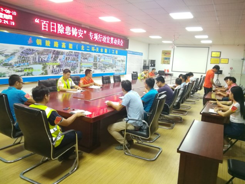 8月10日晚,銅陵路高架項(xiàng)目部組織召開(kāi)“百日除患鑄安”動(dòng)員大會(huì),項(xiàng)目部全體職工、“青安崗”成員及班組長(zhǎng)約30人參加,項(xiàng)目部安全部長(zhǎng)曹志強(qiáng)主持會(huì)議。