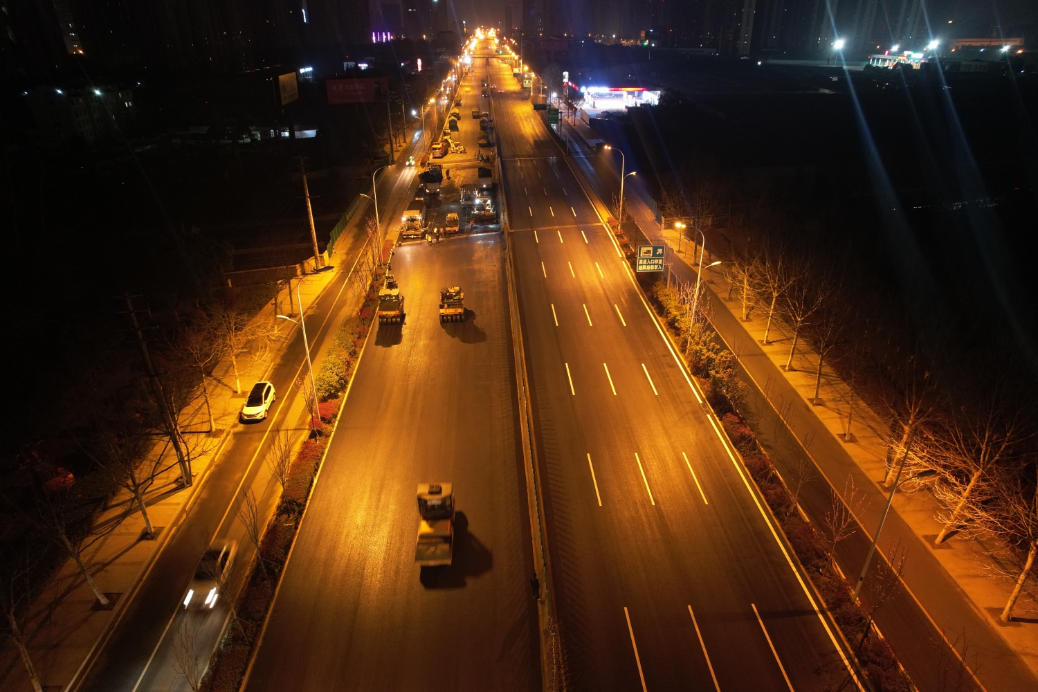施工前,項(xiàng)目部提前謀劃,確定最優(yōu)材料、配合比及施工工藝。晚上備料、凌晨施工,六臺(tái)攤鋪機(jī)進(jìn)行路面攤鋪,十多臺(tái)壓路機(jī)來(lái)回穿梭,各道工序環(huán)環(huán)相扣,現(xiàn)場(chǎng)分工明確,安全舉措到位。