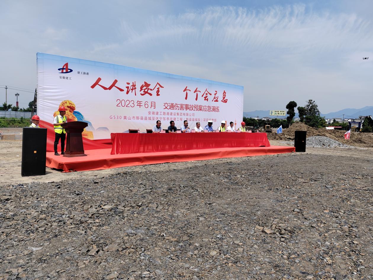 6月15日,G530黃山市黟縣縣城至休寧東亭改建項目開展交通事故應急救援演練。黟縣交通運輸局、應急管理局安徽建工黟縣投資有限公司、監(jiān)理單位等主要負責人現場觀摩,一分公司黨支部書記、總經理林虎、總工張善剛參加活動。