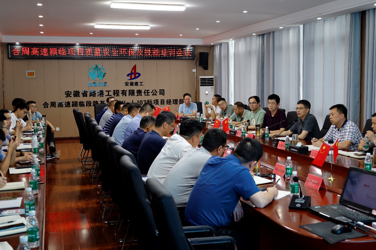 近日,安徽交控集團合周高速項目公司董事長章征一行到路橋分公司合周高速潁臨段路基07標(biāo)組織召開質(zhì)量安全環(huán)保及技能培訓(xùn)會議,合周高速潁臨段項目辦、監(jiān)理及其他兄弟標(biāo)段負(fù)責(zé)人參加。