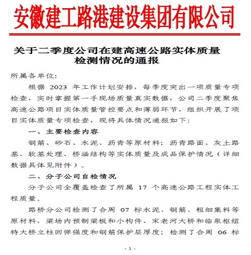 《關(guān)于二季度公司在建高速公路實(shí)體質(zhì)量檢測情況的通報(bào)》文件
