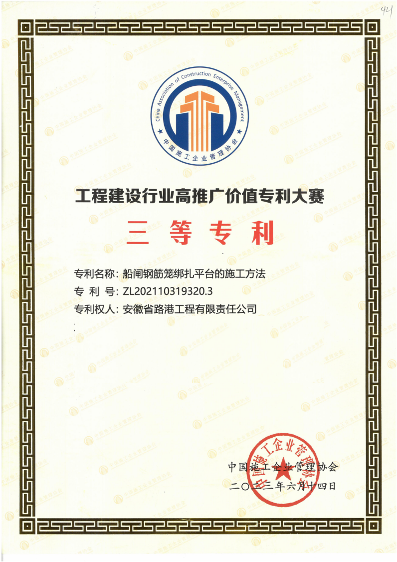 “工程建設(shè)行業(yè)高推廣價值專利大賽”是為促進(jìn)工程建設(shè)行業(yè)科技進(jìn)步與創(chuàng)新,全面提升企業(yè)知識產(chǎn)權(quán)創(chuàng)造、運(yùn)用、保護(hù)和管理水平,挖掘、培育和推介一批易轉(zhuǎn)化、實(shí)用性強(qiáng)和推廣價值高的專利而舉辦的重要專利比賽。建工路港自主研發(fā)的“船閘鋼筋籠綁扎平臺的施工方法”榮獲高推廣價值專利三等獎。該技術(shù)成果作為“造閘機(jī)”的一部分,代表了公司船閘智能建造達(dá)到國內(nèi)領(lǐng)先水平。